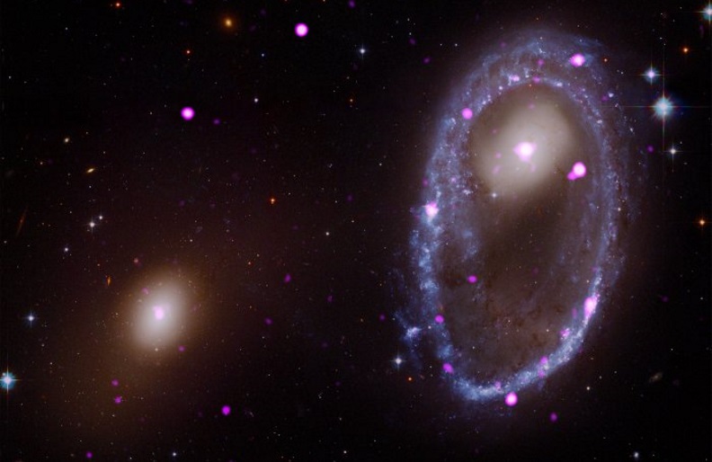 It’s thought that the shape of ring galaxies happens when one galaxy punches through another, leaving a hole in its wake. By combining X-ray data from Chandra with visible-light data from the Hubble Space Telescope, astronomers in Italy and the US have now been able to piece together that process.